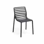Reinterpretación contemporánea de la lama en Doga Bistrot, un asiento de exterior sin reposabrazos de resina reforzada con fibra de vidrio. Es manejable, apilable, fácil de limpiar y completamente reciclable.