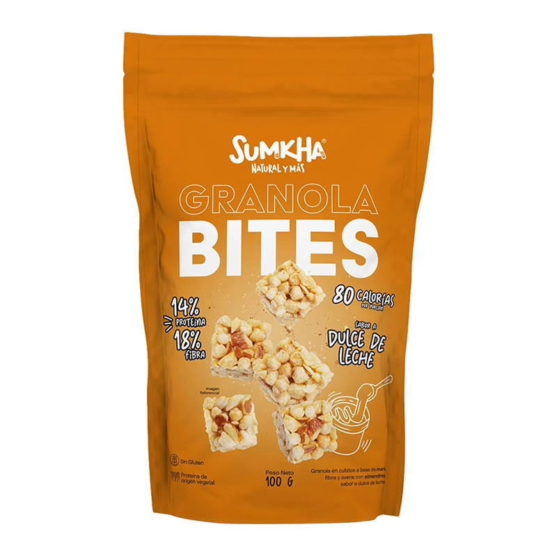 La granola bites es alto en proteína y fibra, bajo en calorías, sin gluten y con sabor a dulce de leche.